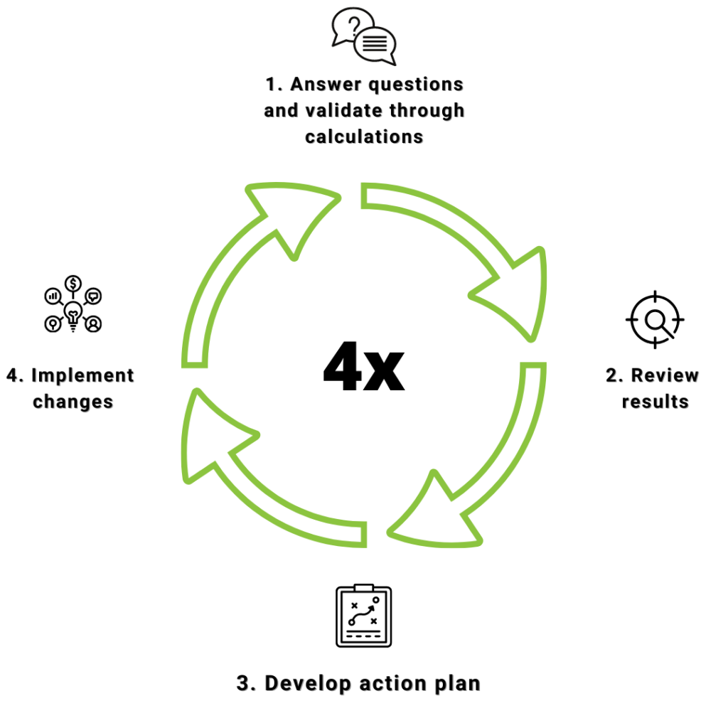 We recommend 4 cycles. 1.You answer the questions, 2.Review the results, 3. Develop an action plan, 4. Implement the changes and then repeat the process. Over a period of 9 months you will be able to evaluate yourself 4 times, with 3 month intervals within which to make the changes.