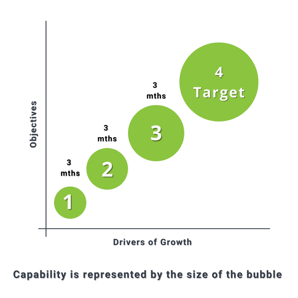 Referring to the graph on the right, the aim is to ensure you have the right capability represented by the size of the bubble, and are winning with respect to the drivers and ultimately objectives that you have defined i.e. the bubble should become larger and move to the top right of the bubble chart.